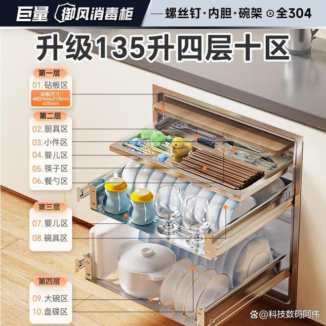 很多朋友不喜欢消毒柜工作时的臭氧味,那这款御风系列就是你的救星。它采用的是100℃环流热风技术,完全没有臭氧异味。双风机设计能让热风穿透餐具的每一个缝隙,烘干效果极好,拿出来的碗盘是暖烘烘、干爽爽的。这款特别适合母婴家庭,因为它有独立的母婴层,而且做了加高设计,那些奇形怪状的辅食碗、吸管杯都能轻松放入。135L的大容量,五口之家的餐具囤积一天洗一次也没压力。