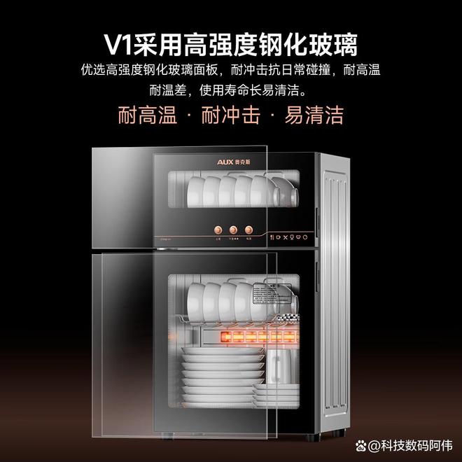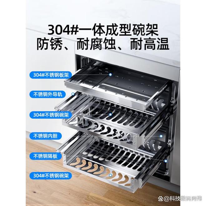 如果你的厨房装修比较现代,森太这款的高颜值绝对能打动你。黑晶面板看起来非常高级,而且很好打理。不仅仅是好看,它的内功也很深厚:125℃高温配合紫外线双重消杀,自带烘干功能,彻底告别南方回南天餐具发霉的烦恼。它采用的是三层抽屉式设计,大概能放15个碗盘加上口炒锅。最贴心的是它的304内胆可以直接冲洗,对于那种不想花太多时间打理厨房的年轻人来说,简直是懒人福音。